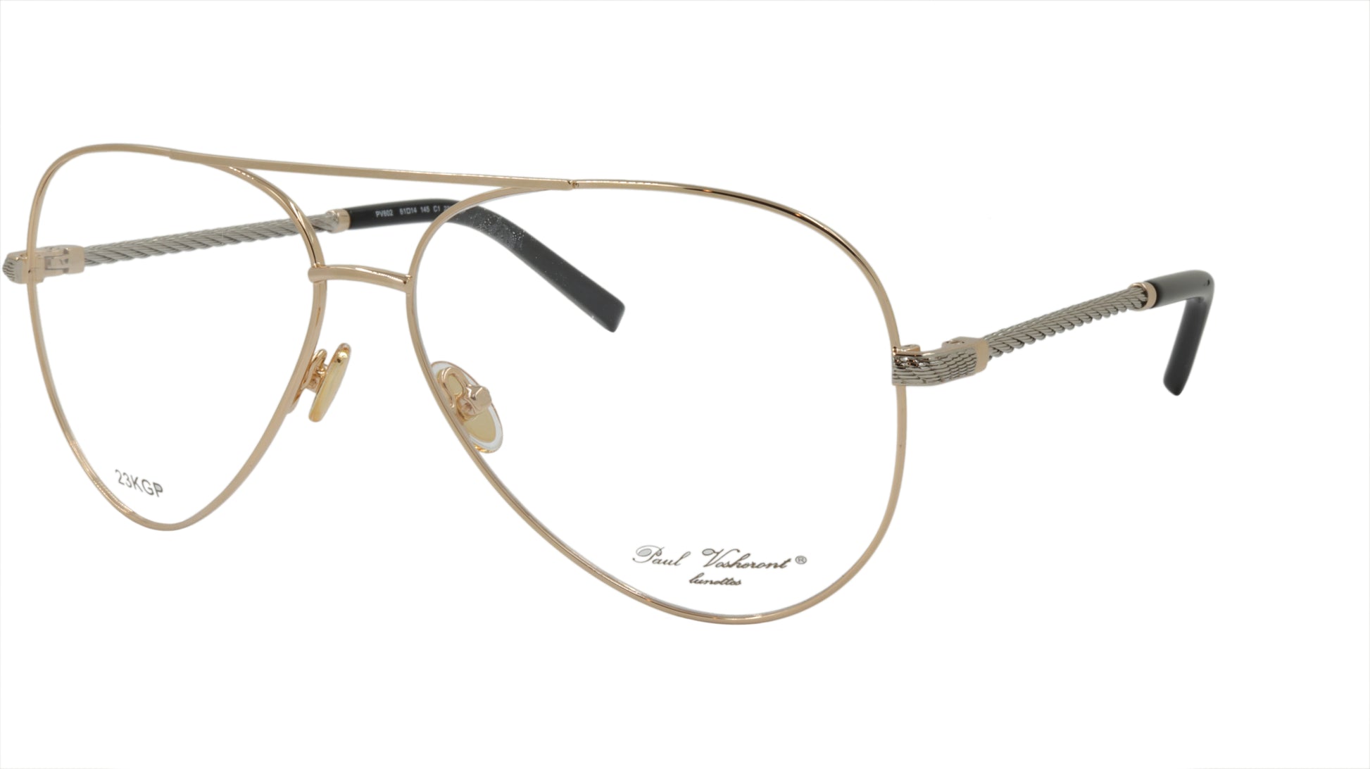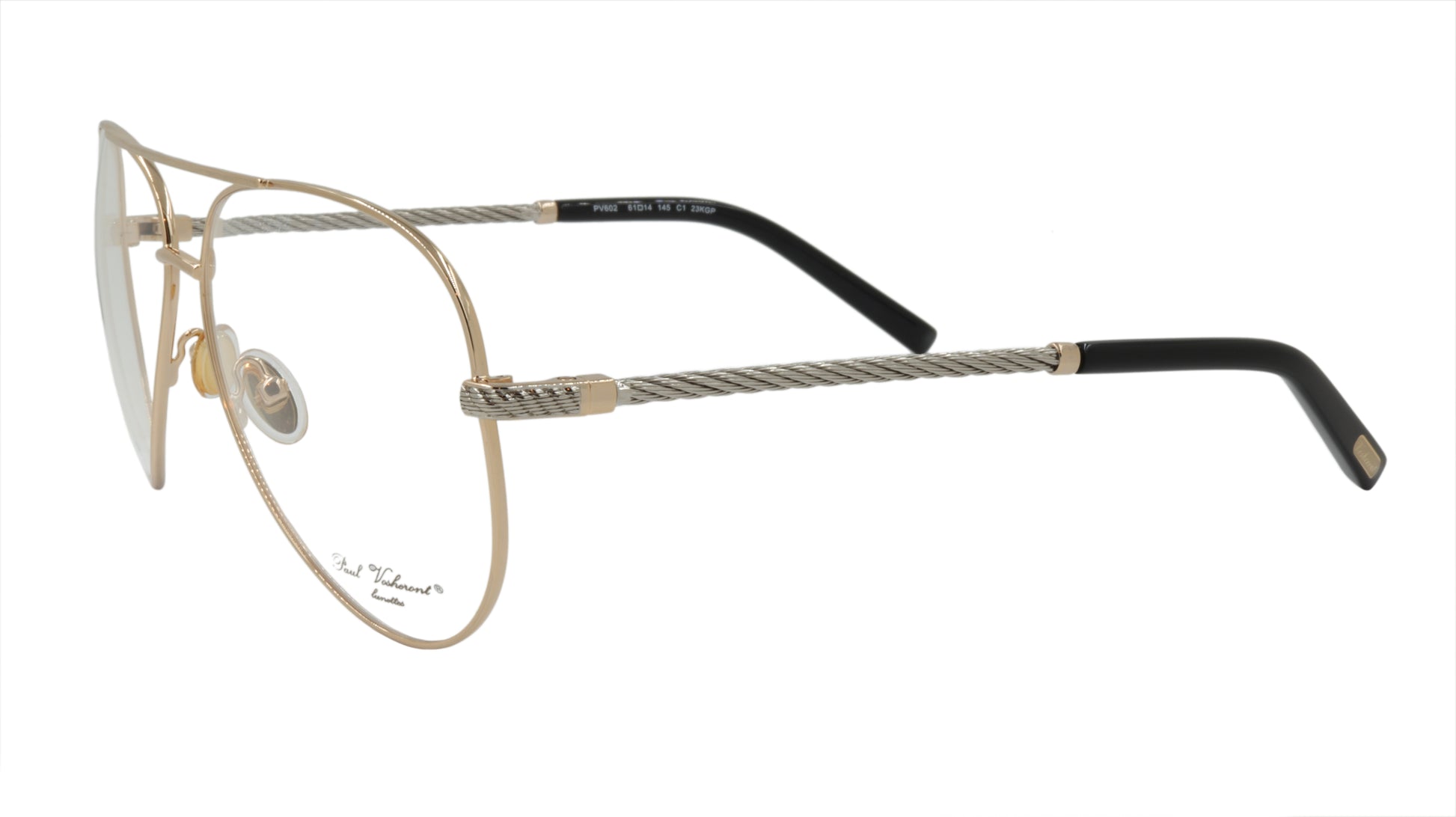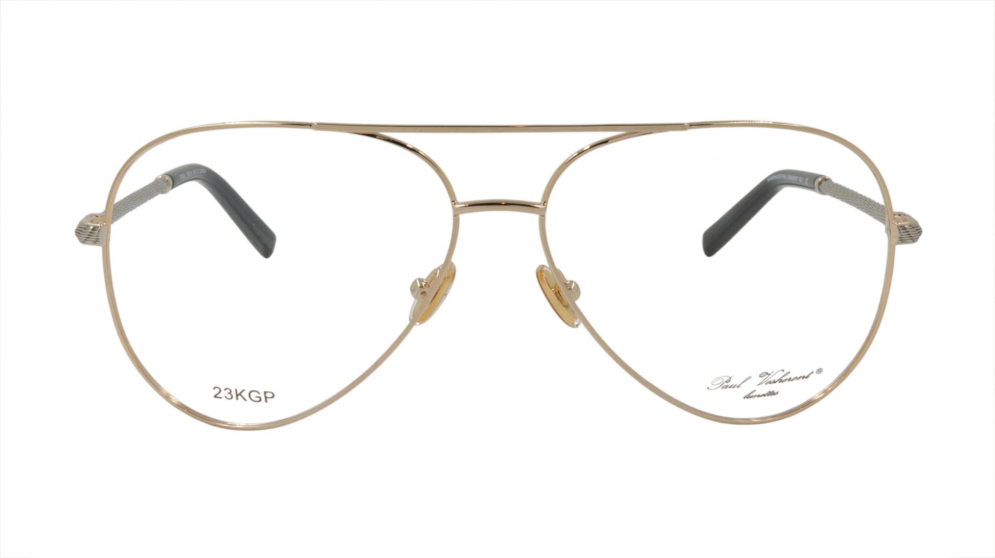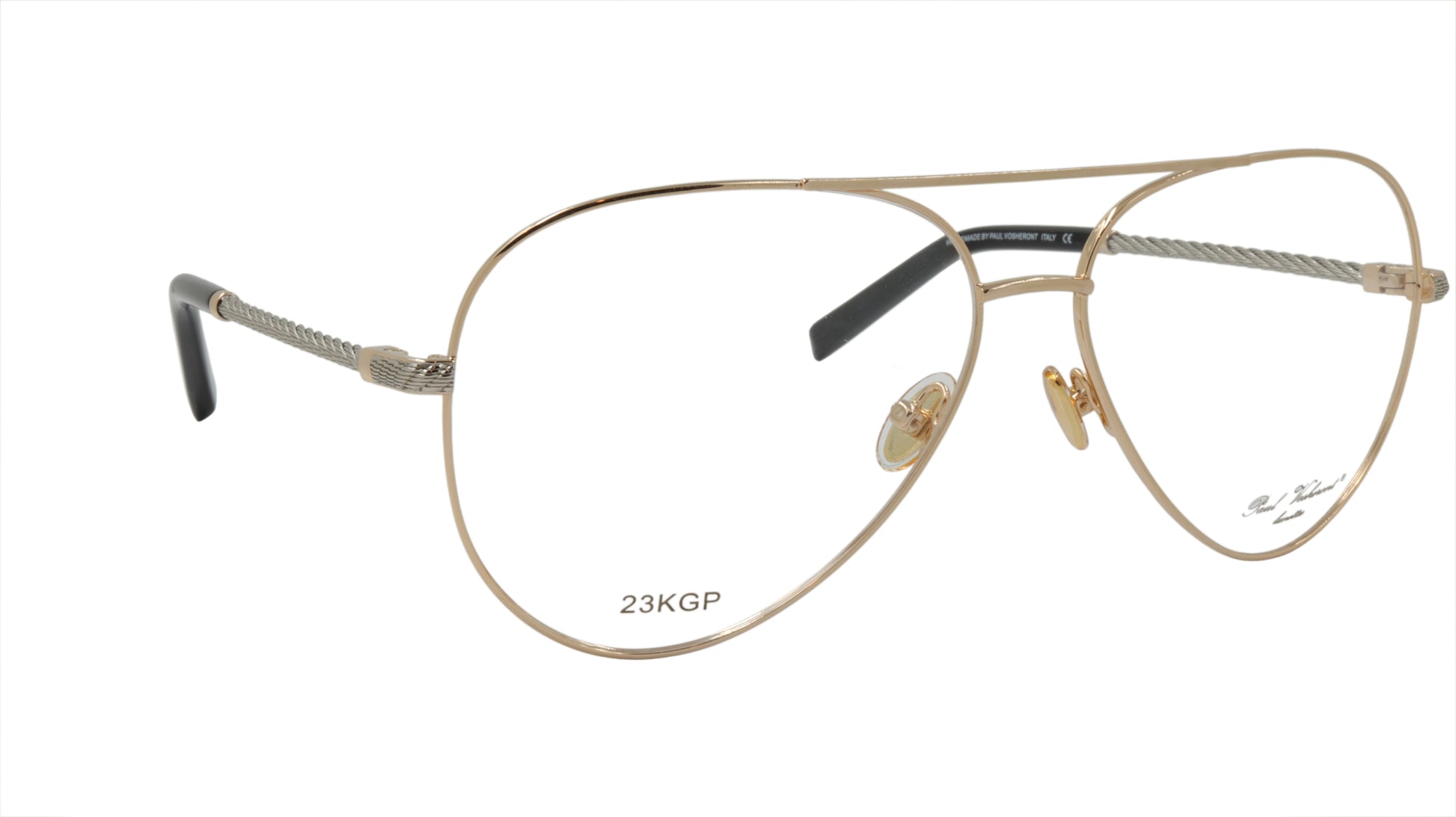 Paul Vosheront men's designer eyewear, in the classic aviator style with gold frame and silver twist style arms with gold accent. Framebay is an authorized dealer of their men's designer eyewear.