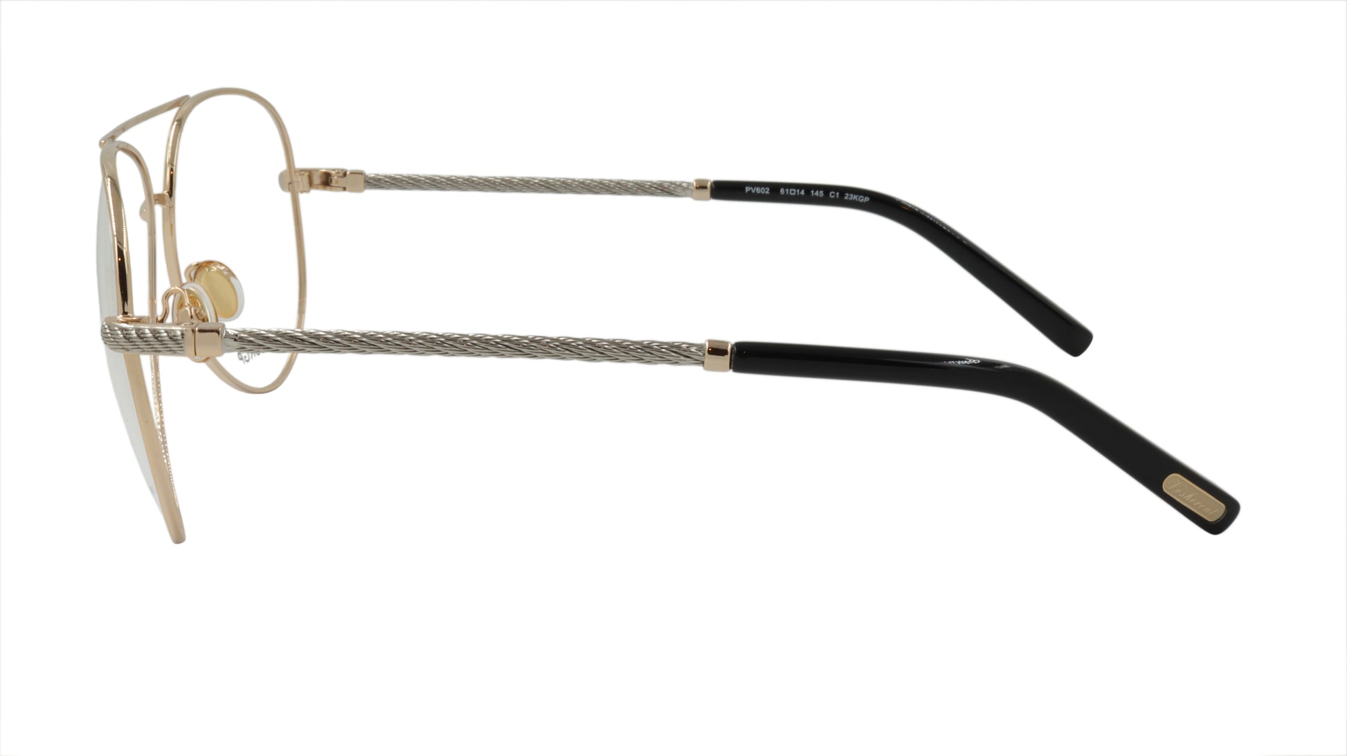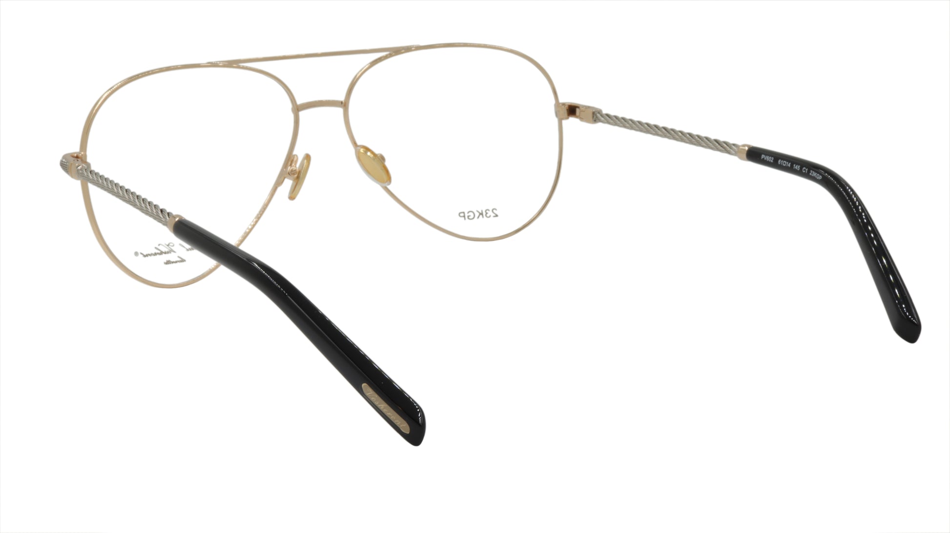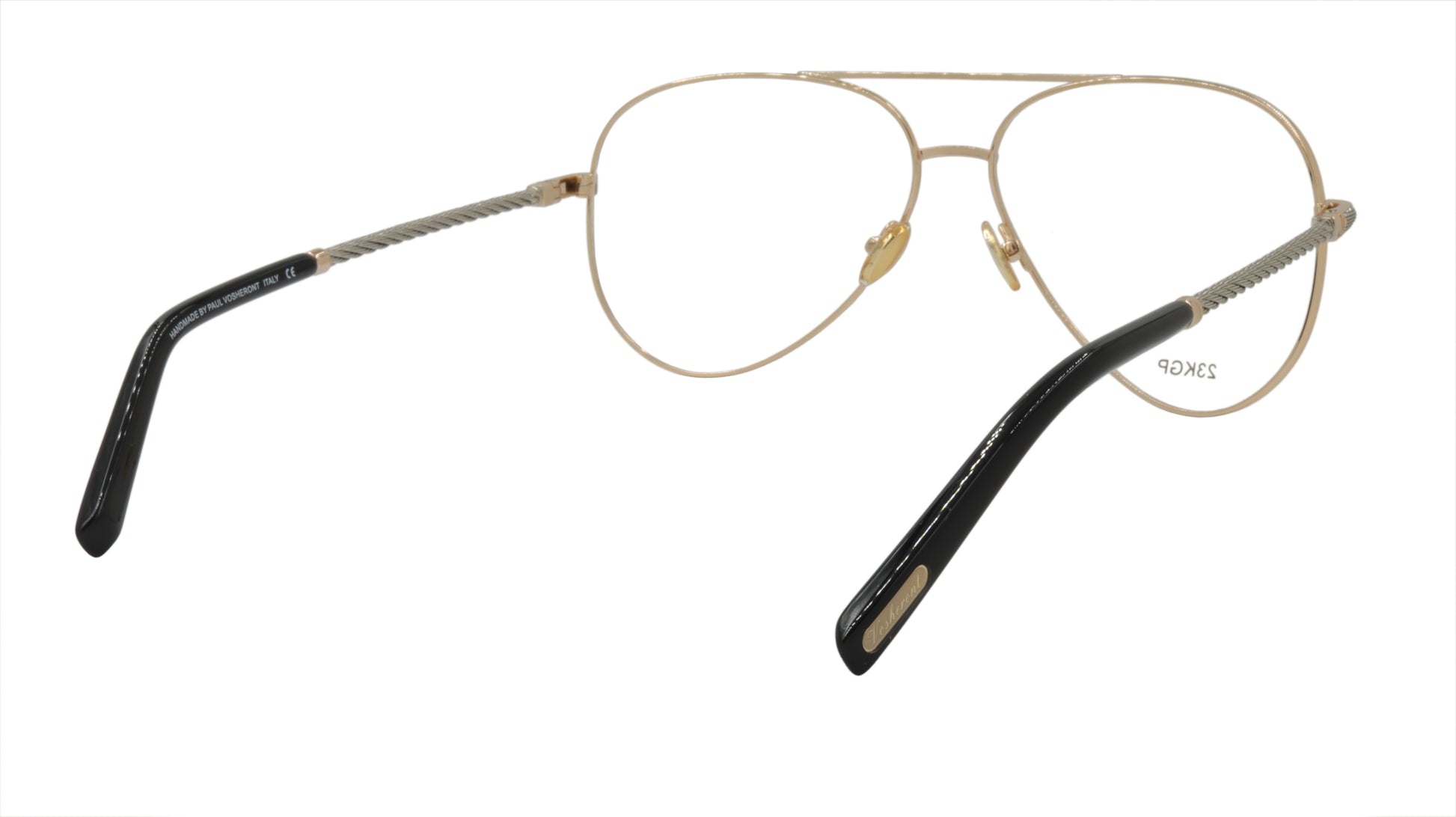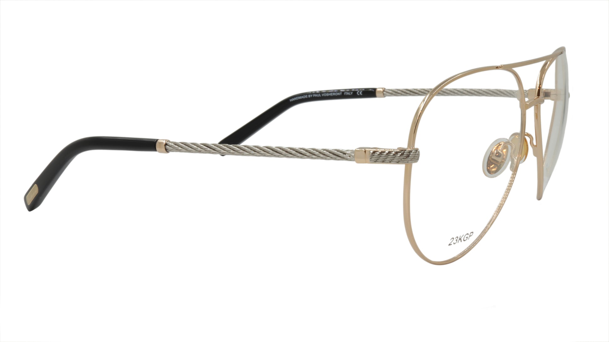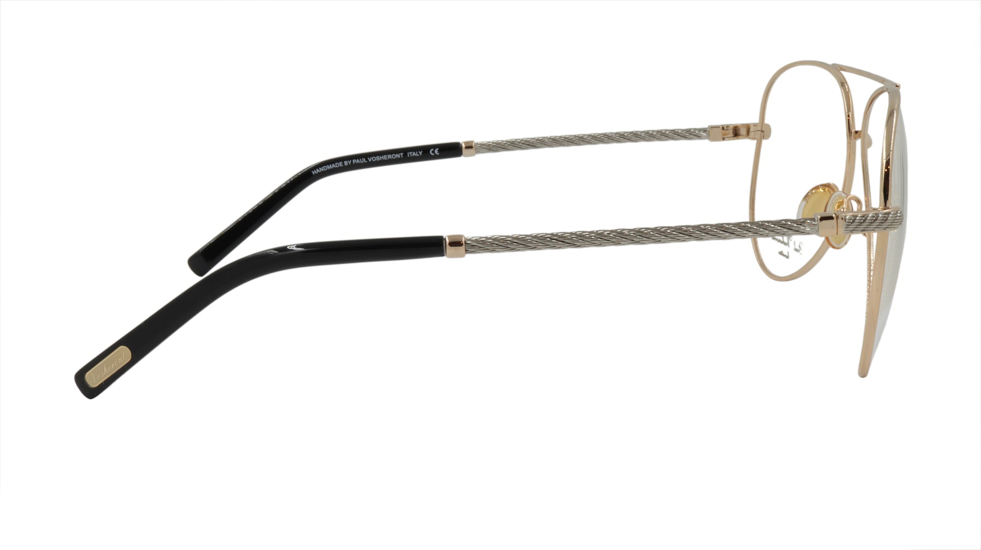 Paul Vosheront men's designer eyewear, in the classic aviator style with gold frame and silver twist style arms with gold accent. Framebay is an authorized dealer of their men's designer eyewear.