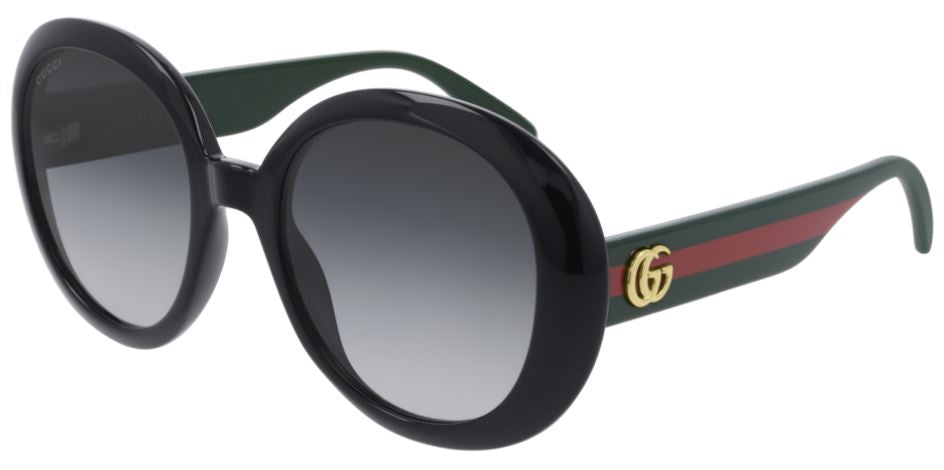 Best Seller Carry over concept from SS17. Round oversize sunglass for or diva-like look. Gucci interlocking logo on temples. Feminine color palette; transparent tones on the front combined with gradient colors on temples.